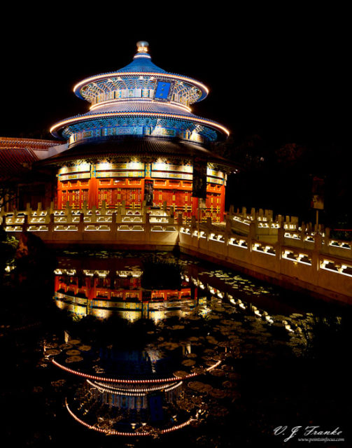 EPCOT After Dark: China Reflections 6Dec2011 5 min read Walt Disney World’s China pavilion’s Temple of Heaven lit and reflected in the water garden.